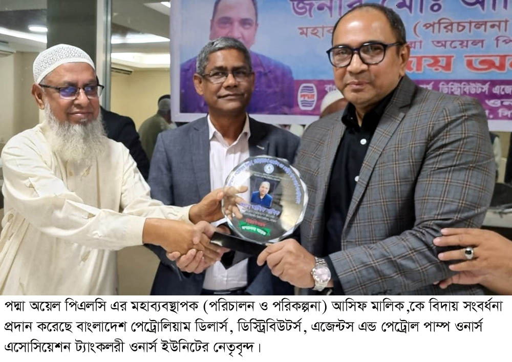 পদ্মা অয়েল পিএলসি এর মহাব্যবস্থাপক (পরিচালন ও পরিকল্পনা) আসিফ মালিক,কে বিদায় সংবর্ধনা