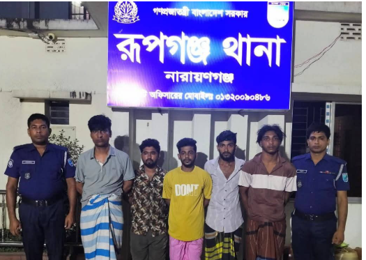 গোপন সংবাদের ভিত্তিতে মুড়াপাড়া ইউনিয়নের মাছিমপুর মিরগদাই এলাকার সিরাজুল ইসলামের একটি পরিত্যক্ত ভবনে অভিযান চালিয়ে পাঁচজনকে আটক করা হয়। তারা হলেন— ১। রমজান মোল্লা (৩৫), পিতা-আবদুল মান্নান, সাং-মাছিমপুর,২। মো. সবুজ মিয়া (২৬), পিতা-মৃত আবদুল মান্নান, সাং-পাড়াগাঁও,৩। মেহেদী হাসান (২৫), পিতা-ফারুক মিয়া, সাং-ছোনাব,৪। এনামুল হক (১৯), পিতা-আজিজুল হক, সাং-ব্রাহ্মণগাঁও,৫। সুমন মিয়া (২৪), পিতা-খোকন মিয়া, সাং-ভায়েলা, সকলেই রূপগঞ্জ থানার অন্তর্গত বিভিন্ন গ্রামের বাসিন্দা।