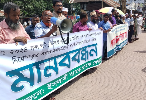 ইসলামী ব্যাংকে অদক্ষ কর্মকর্তাদের ছাঁটায়ের দাবীতে মানববন্ধন