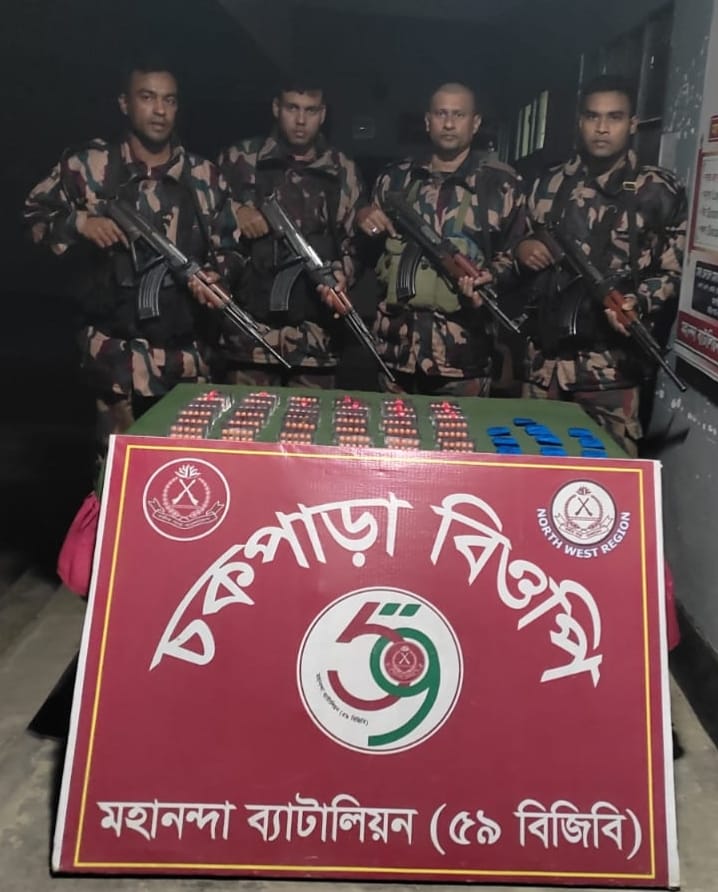 চাঁপাইনবাবগঞ্জ মহানন্দা ব্যাটেলিয়ান (৫৯ বিজিবি) সদস্যরা সীমান্তে সর্বদা সচেষ্ট অবস্থায় দায়িত্ব পালন করছে। এরই ধারাবাহিকতায় ১১ নভেম্বর ২০২৫ তারিখ সন্ধ্যা