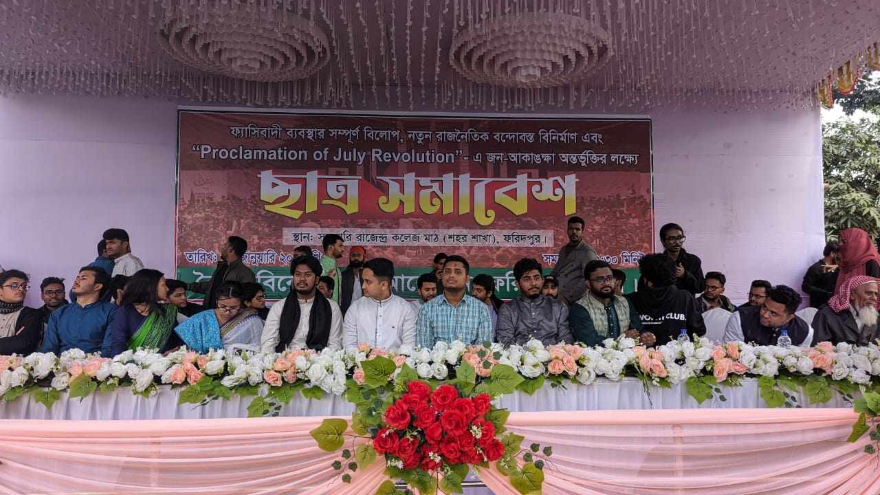 ফরিদপুরে বৈষম্যবিরোধী ছাত্র আন্দোলনের উদ্যোগে শহরের রাজেন্দ্র কলেজ মাঠে সোমবার বিকেলে ছাত্র সমাবেশ অনুষ্ঠিত হয়েছে। মঞ্চে উপস্থিত ছিলেন বৈষম্য বিরোধী ছাত্র আন্দোলনের